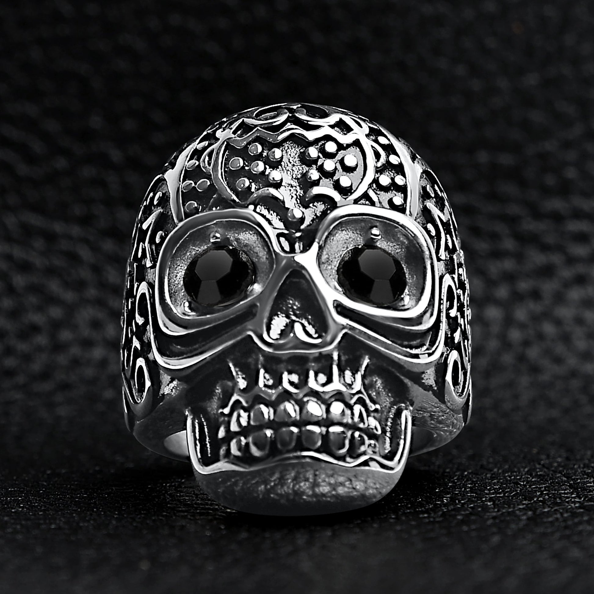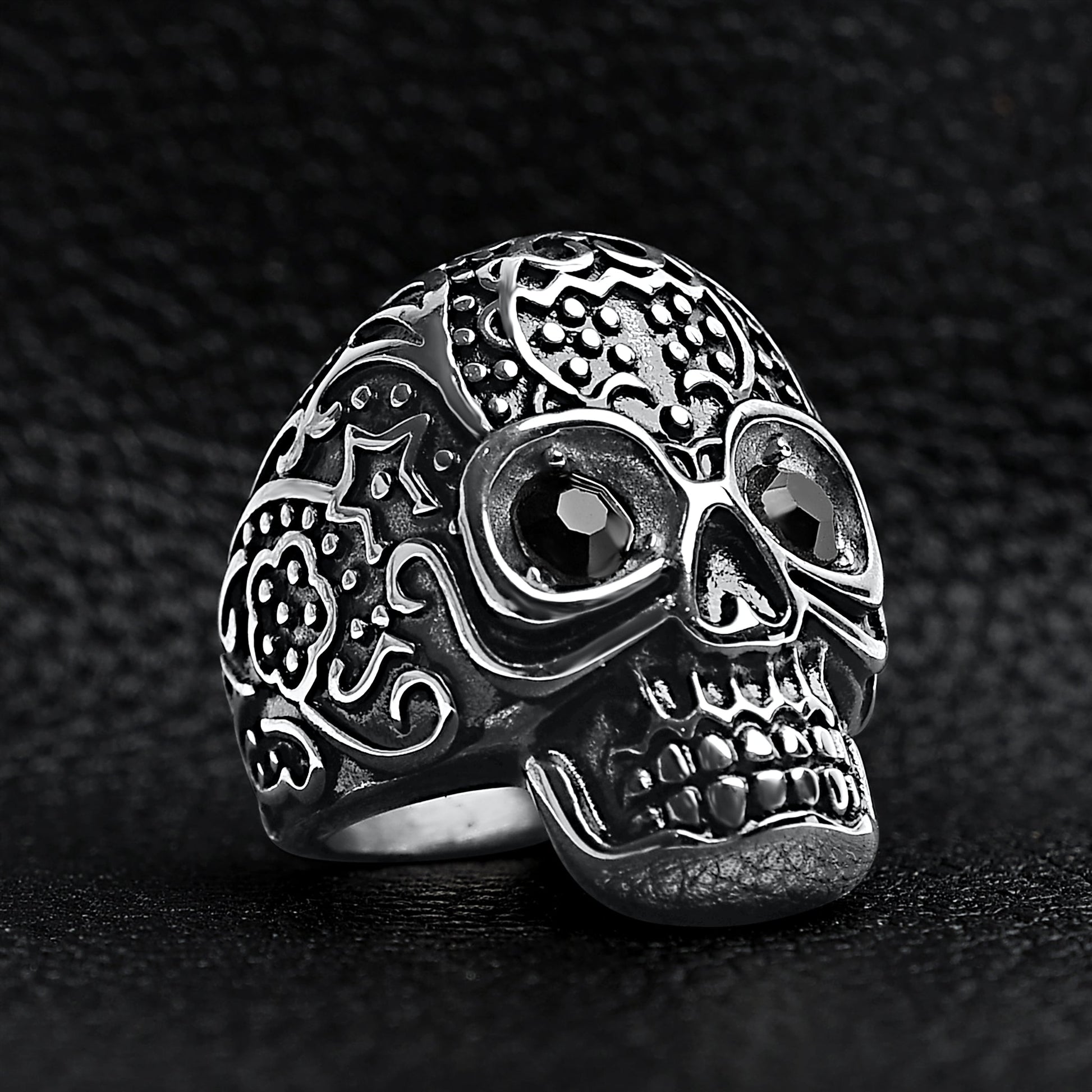 Black CZ Eyed Detailed Skull Stainless Steel Ring