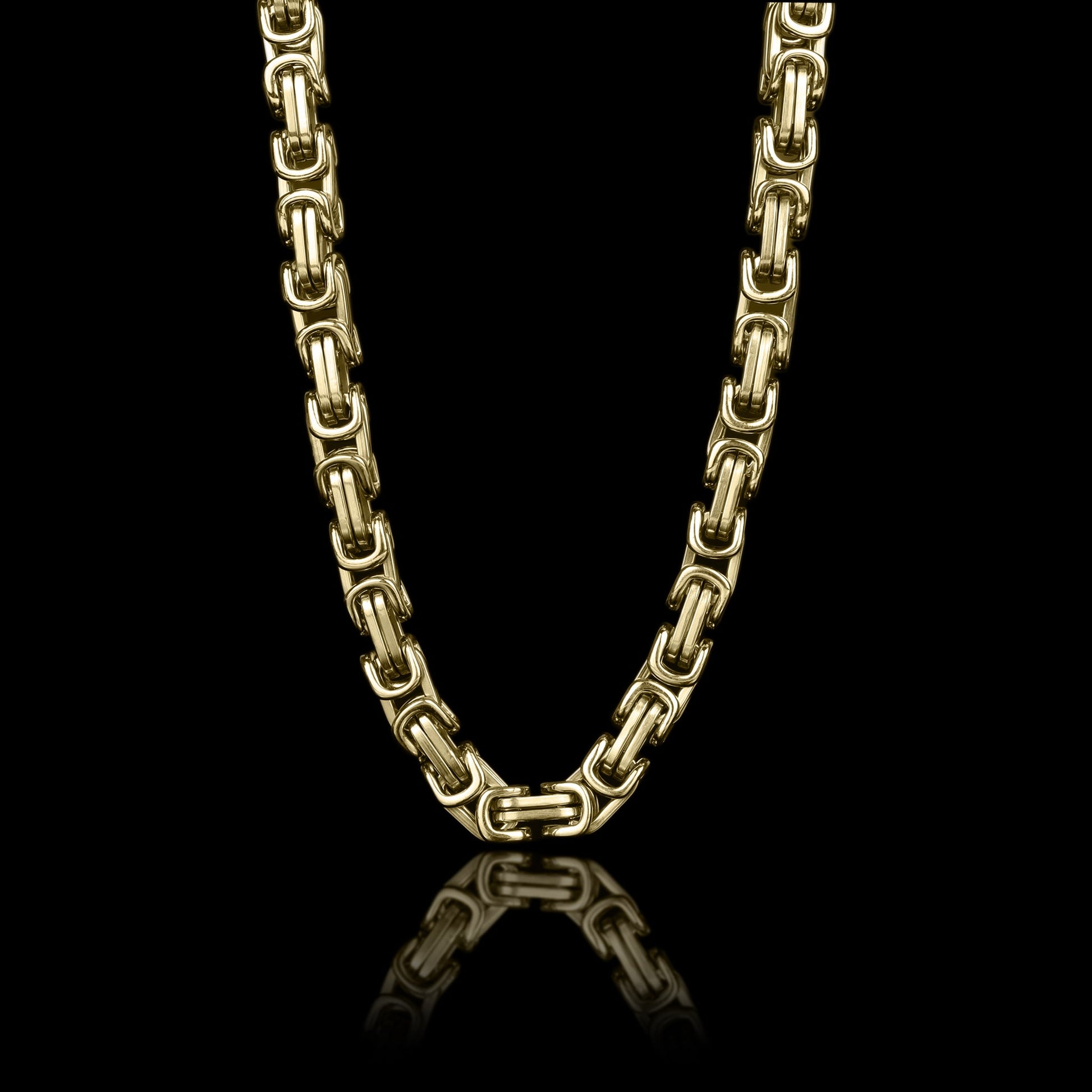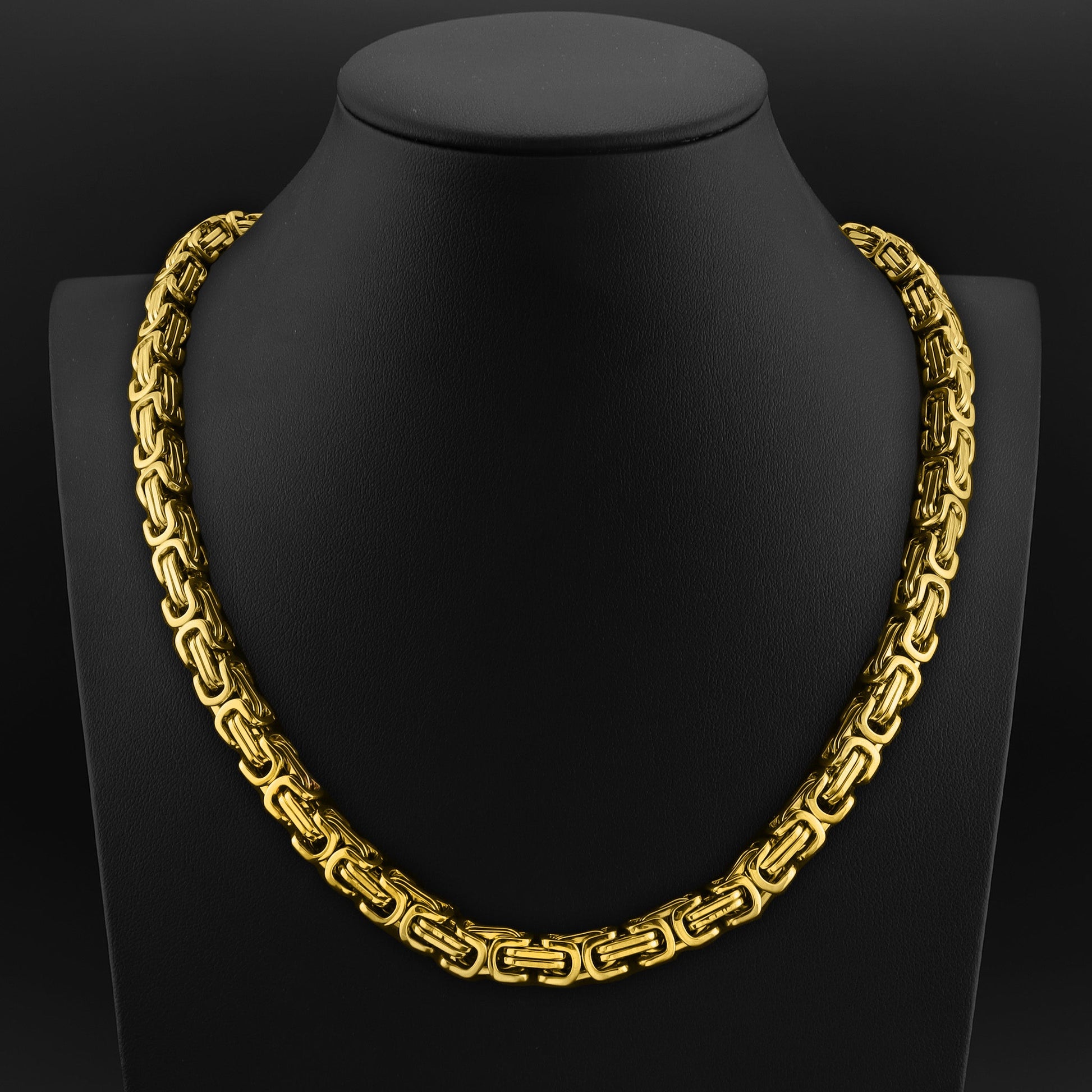 The 18K Gold Byzantine Chain Necklace is a premium style piece. Made with interlocked links of polished 18K Gold PVD coated stainless steel in a unique Byzantine chain design, this chain necklace is a killer piece to keep in your collection. The Byzantine chain necklace is great for wearing alone as a bold and unique upgrade to any look. This chain is available in a variety of widths, you can choose a smaller width for a minimalist look, or choose a larger width to wear more as a statement piece. So whether you treat yourself or gift to a loved one, this unique Gold Byzantine Chain Necklace is a sure winner for any style for both men and women.