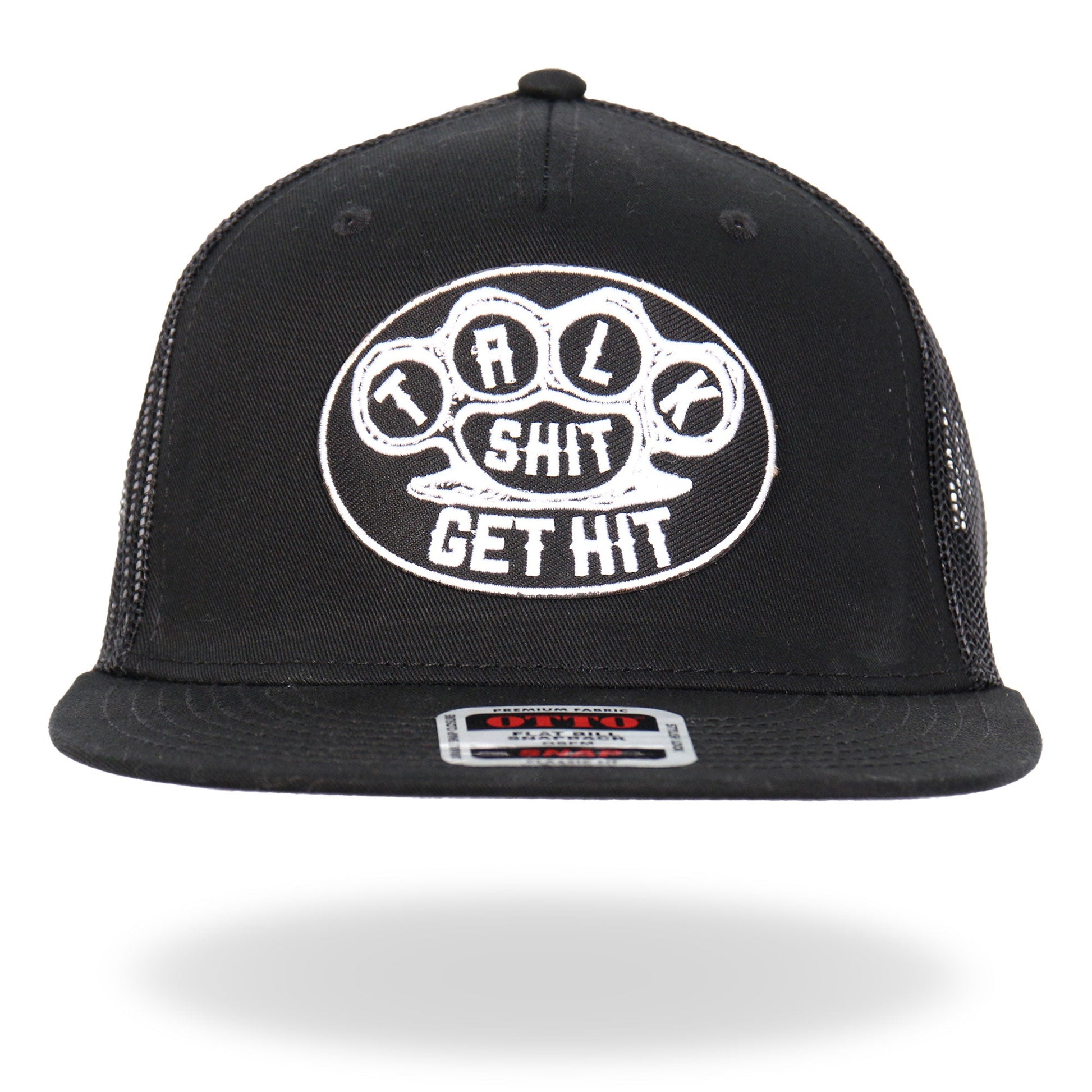 This hat features a black and white patch reading "Talk Shit Get Hit".