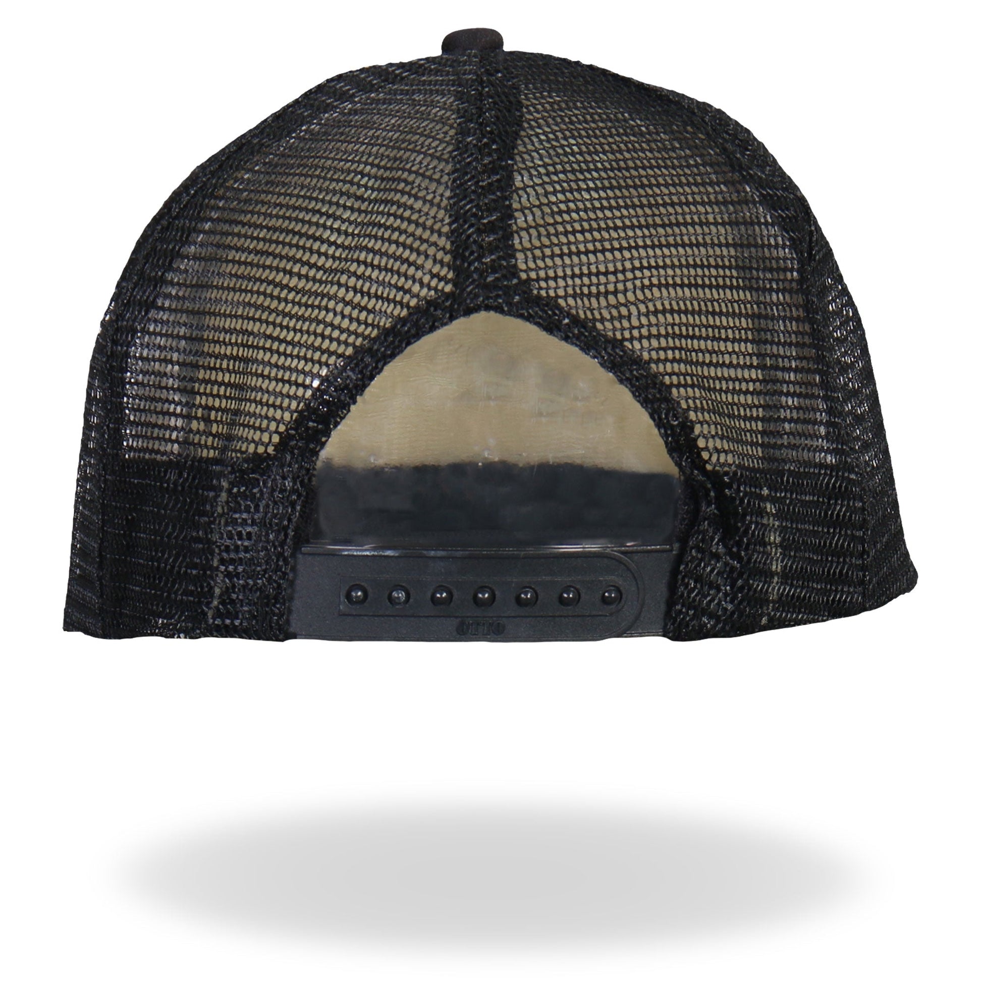 Hot Leathers® trucker hats are made of 5 panel quality construction featuring an original Hot leathers® patch on the front. Each one is adjustable with a flat or curved bill and a mesh back with a snap closure.