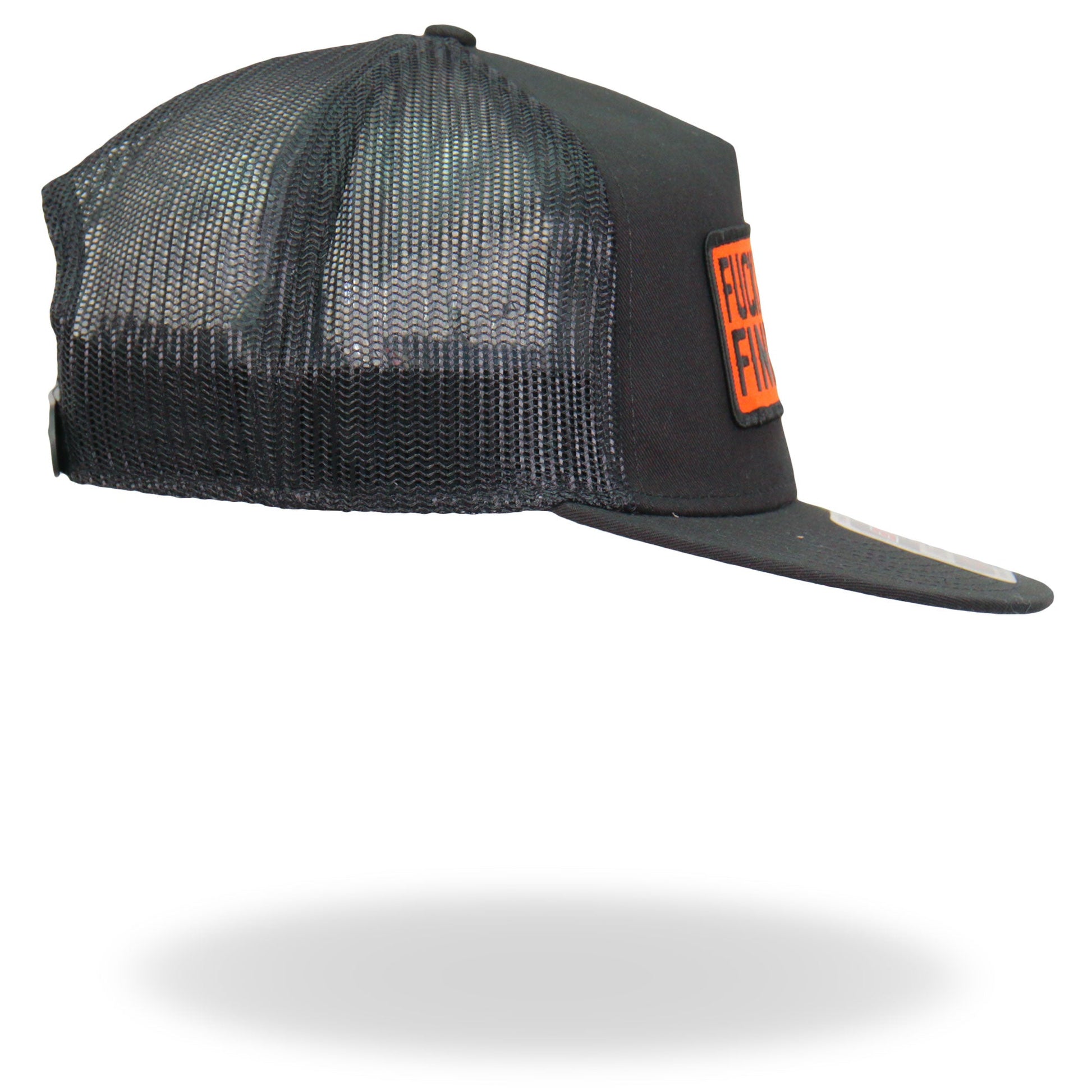 Hot Leathers Snap Back Hat. We use Otto Brand for our hat collection. This is the best snap back flat brim hat in the industry. Its a cotton/polyester blend helps the hat hold its shape for long time use. It is a mesh style back hat with a plastic adjustable tab and features a great Hot Leathers art patch.