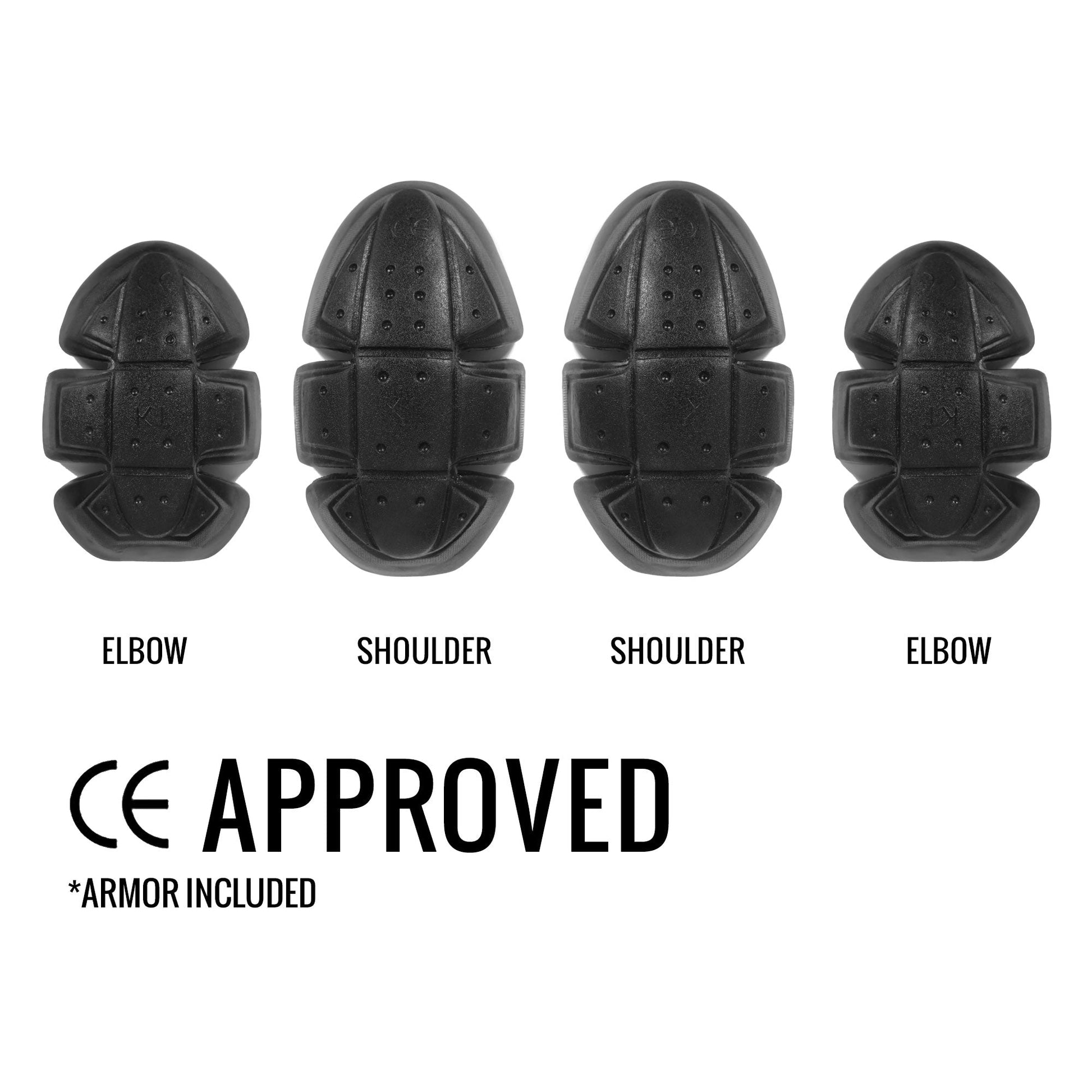 - Removable CE Approved Armor Pads on Shoulder and Elbows