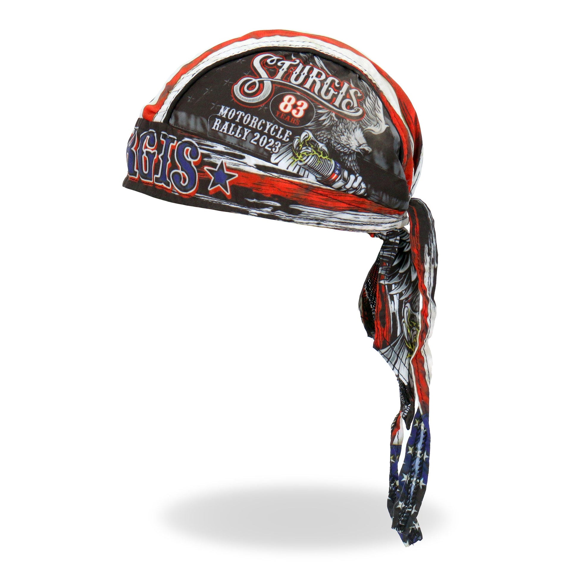 Show your pride while at the 2023 Sturgis Rally, stay UV protected and keep your sweat under control with this Hot Leathers premium doo rag head wrap! Showcasing a bright, long lasting design sure to turn heads! This head wrap features our original red, white and blue American flag stars and stripes design.