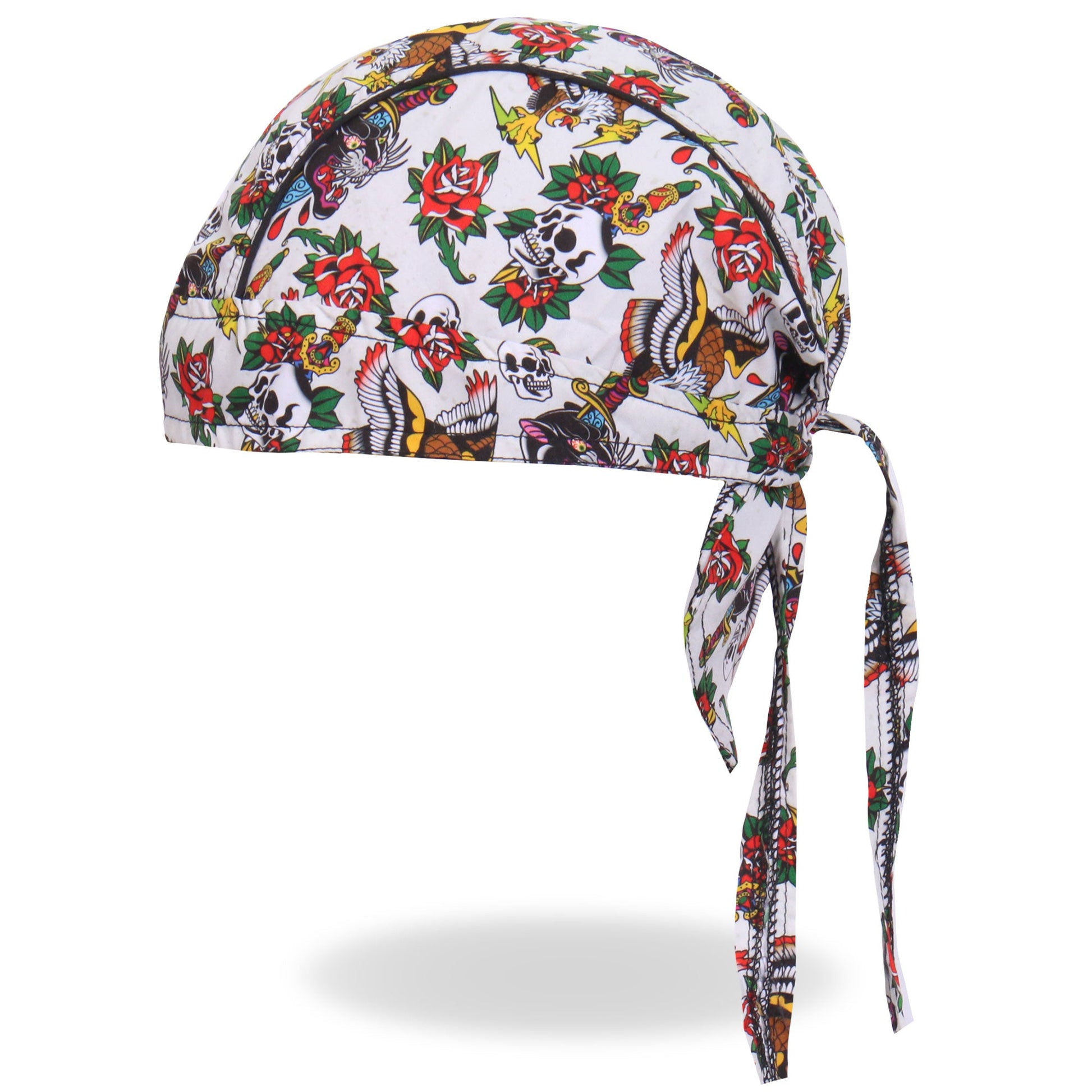 Whether you're hitting the road for a joyride on your motorcycle, getting together with your club, or just need some UV protection and sweat control, Hot Leathers premium doo rag head wraps are just what you need! Put on your new headwrap bandana while you run errands or handle some yard work. Represent your unique style with our moisture wicking, mesh lined head wraps, showcasing bright, long lasting designs sure to turn heads! This head wrap features our classic colorful tattoo flash design.