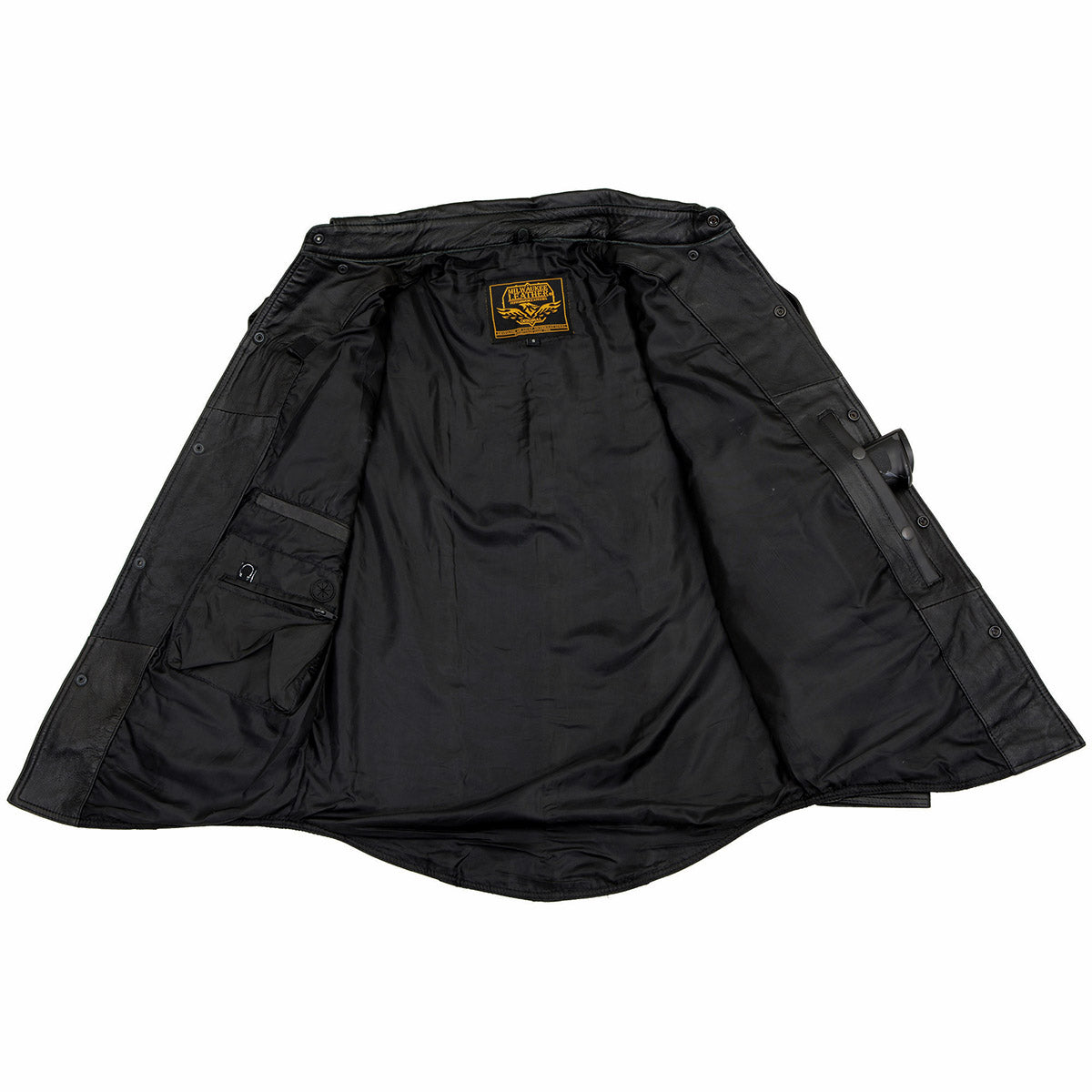 When It’s Time to Ride, This Black Motorcycle Shirt Jacket Helps You Hit the Bike in Style. The Milwaukee Leather Men’s Lightweight Leather Motorcycle Shirt Jacket Is Made of Premium Black Leather with A Soft, Lightweight Satin Liner. Features A Conceal Carry Pocket, Four Outside Pockets and A Snap Down Shirt Collar with Jean Pocket Styling for Cruiser Style Motorcycle Riders. It’s Just What You Need to Pull Together Your Overall Look, And You’ll Look Forward to Wearing It Often.