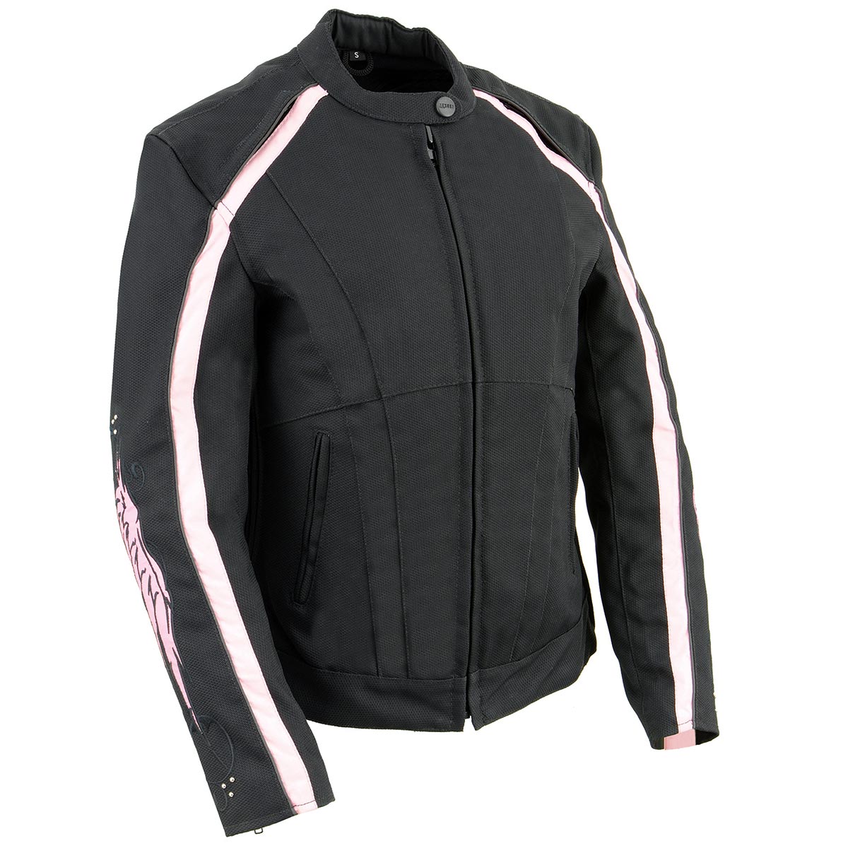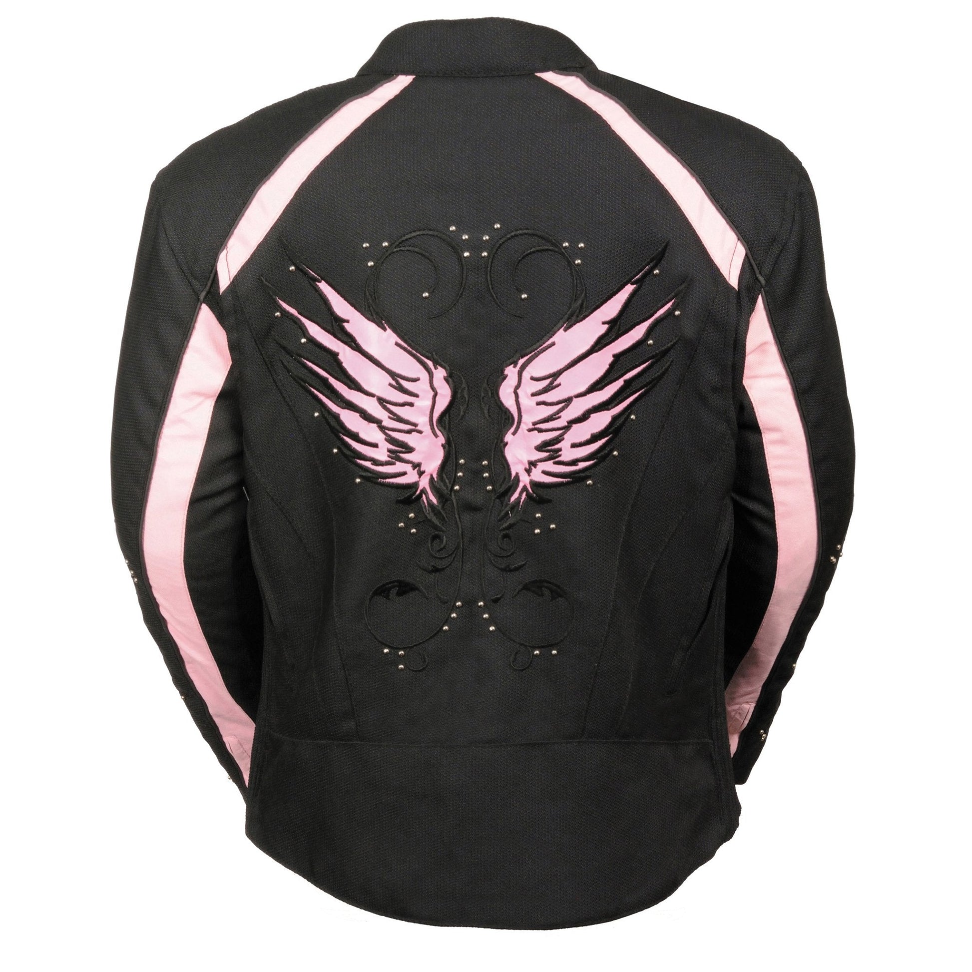 Milwaukee Leather SH1954 Women's Black and Pink Textile Jacket with Stud and Wings Detailing