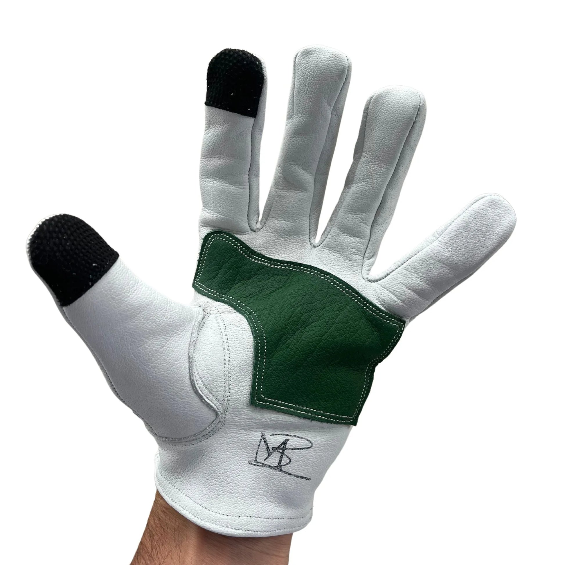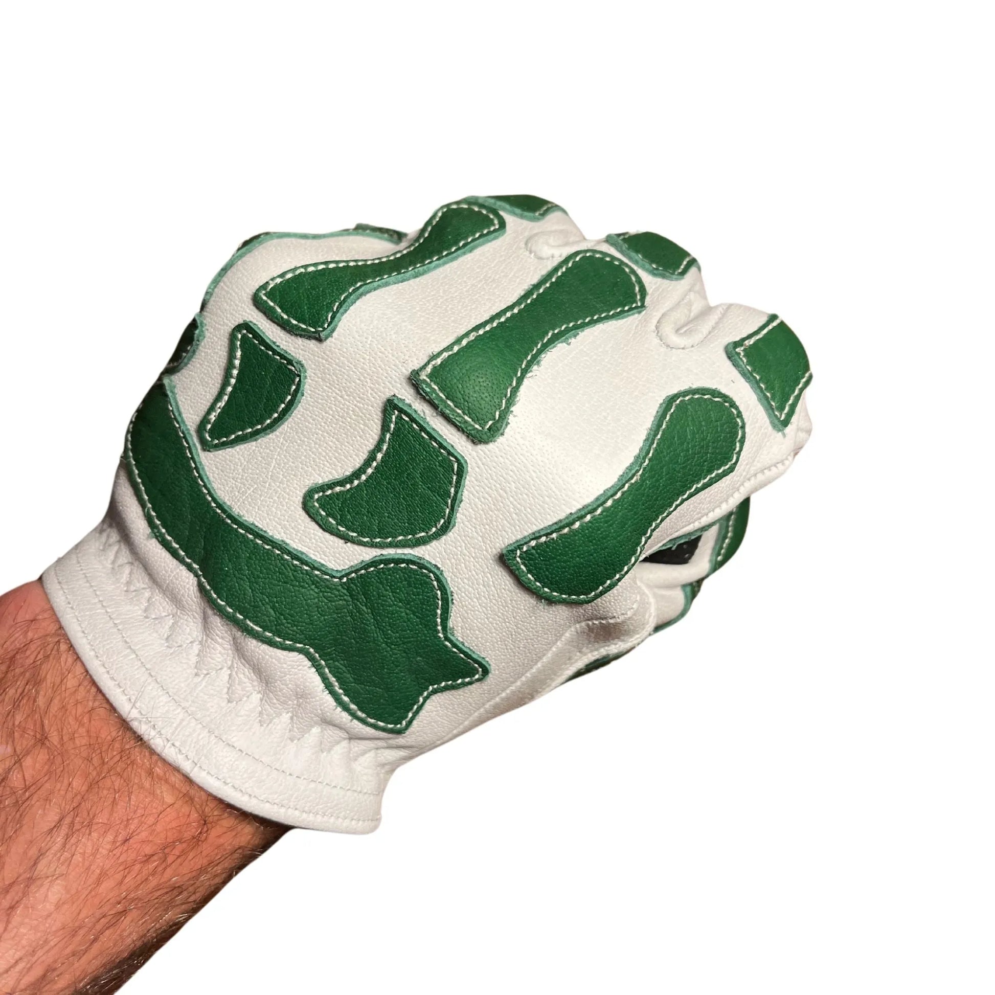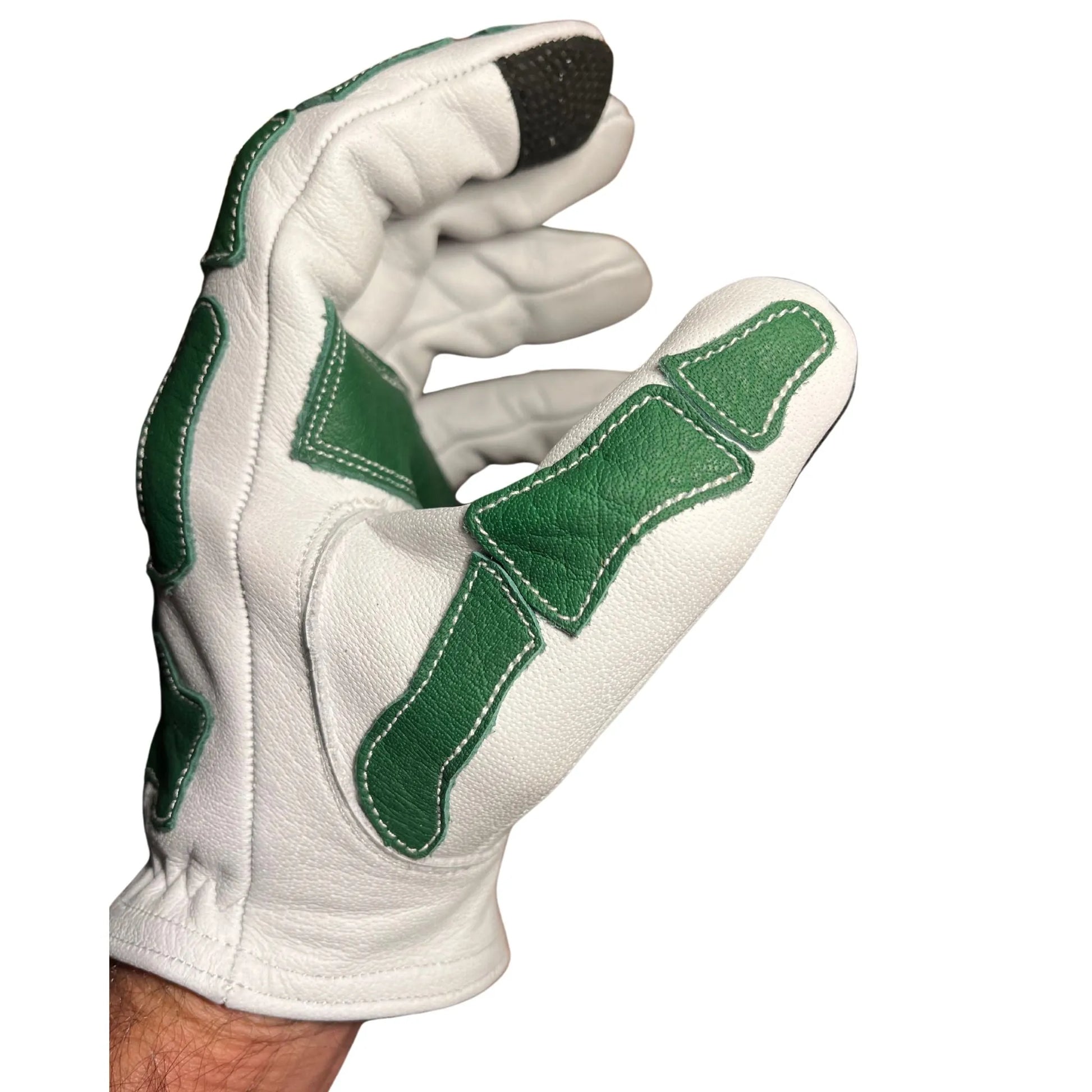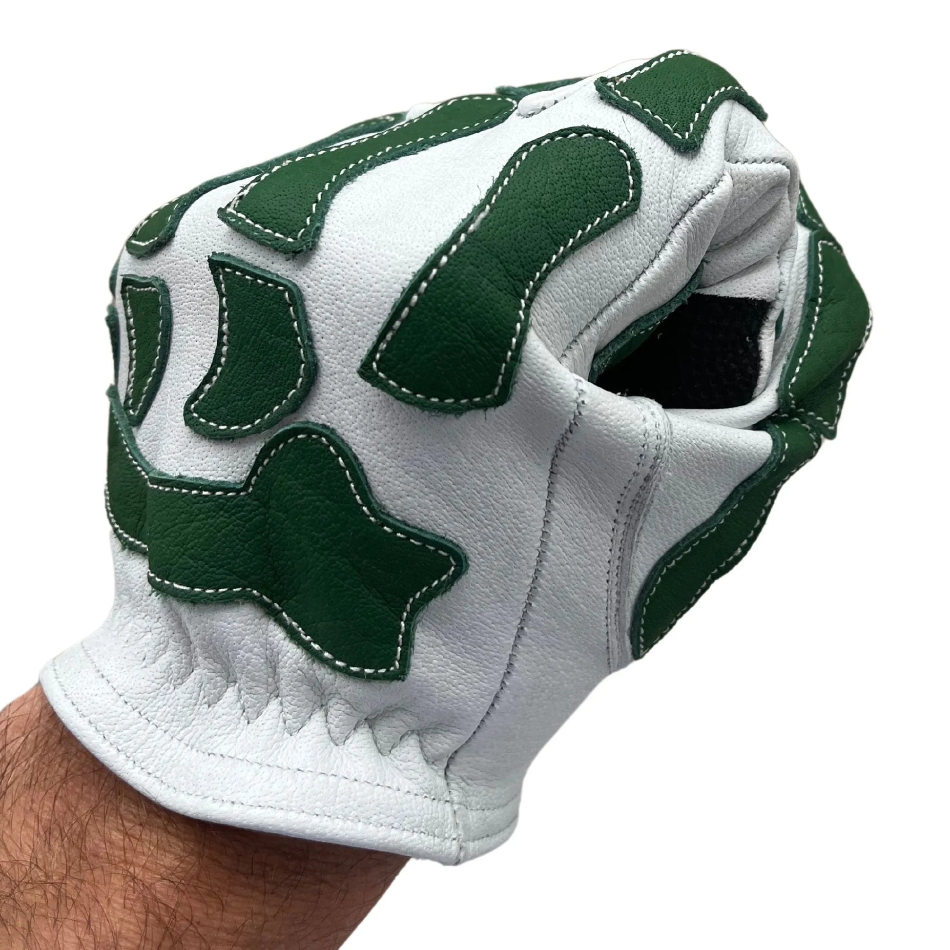 Introducing the White and Green Skeleton glove, a bold statement of HANDCRAFTED EXCELLENCE and STRENGTH. It boasts of an impressive construction using full grain Water Buffalo hide, ensuring the fibers are intact for MAXIMUM DURABILITY. This glove molds specifically to your hand, delivering a unique blend of COMFORT and USABILITY. With a striking aesthetic brought by 40 hand-stitched buffalo leather pieces, it’s not just a glove - it’s a style statement. And, thanks to the tech fabric stitched into the index finger, you can engage with tech devices seamlessly. Its water-friendly feature adds an extra touch of practicality, while its puncture, tear and abrasion resistance assure you a superior level of hand protection.