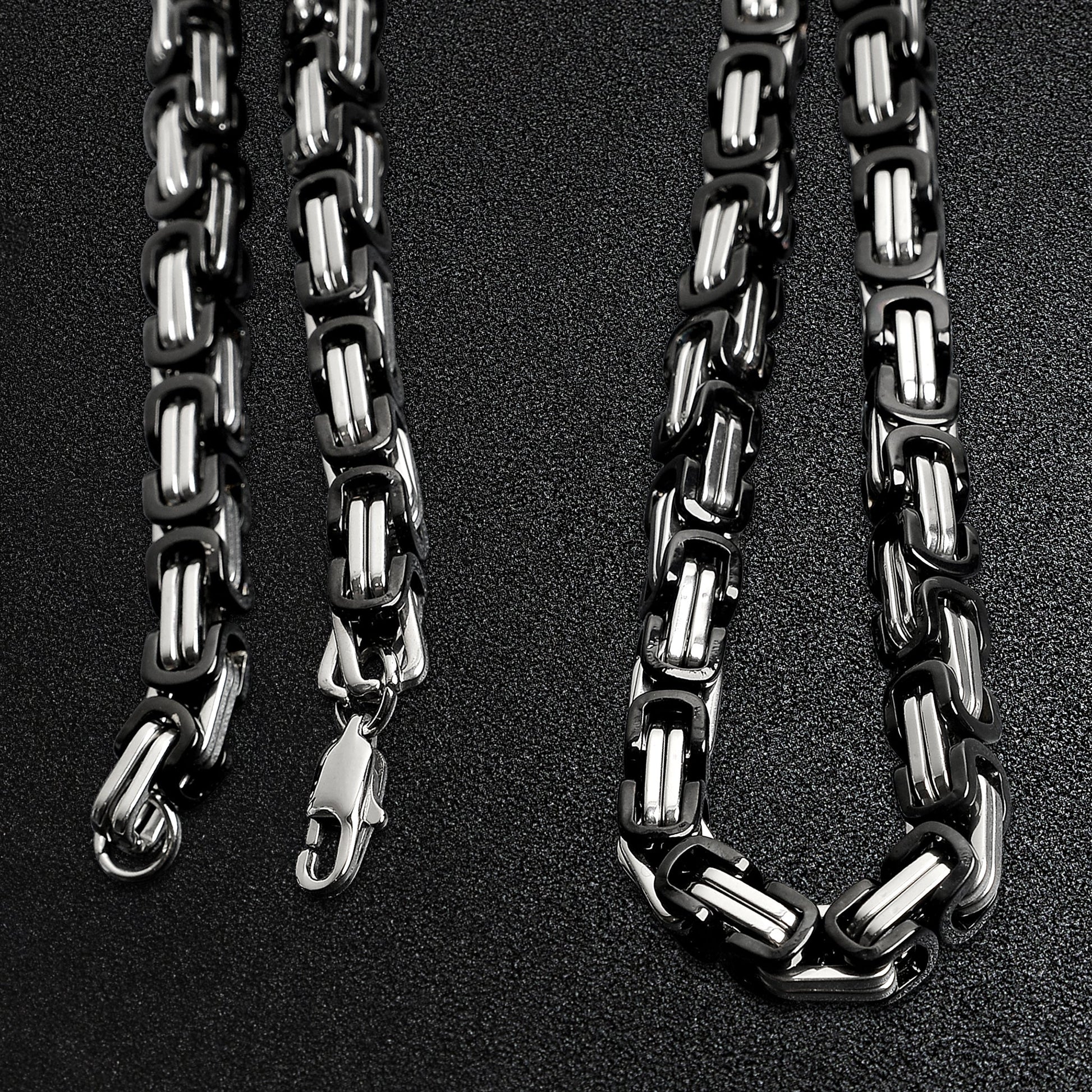 The Stainless Steel And Black Byzantine Chain Necklace is a premium style piece. Made with heavy interlocked links of polished silver and black stainless steel in a unique Byzantine chain design, this chain necklace is a killer piece to keep in your collection. The Stainless Steel and Black Byzantine chain necklace is great for wearing alone as a bold and unique upgrade to any look. This chain is available in a variety of widths, you can choose a smaller width for a minimalist look, or choose a larger width to wear more as a statement piece. So whether you treat yourself or gift to a loved one, this unique Stainless Steel and Black Byzantine Chain Necklace is a sure winner for any style for both men and women.