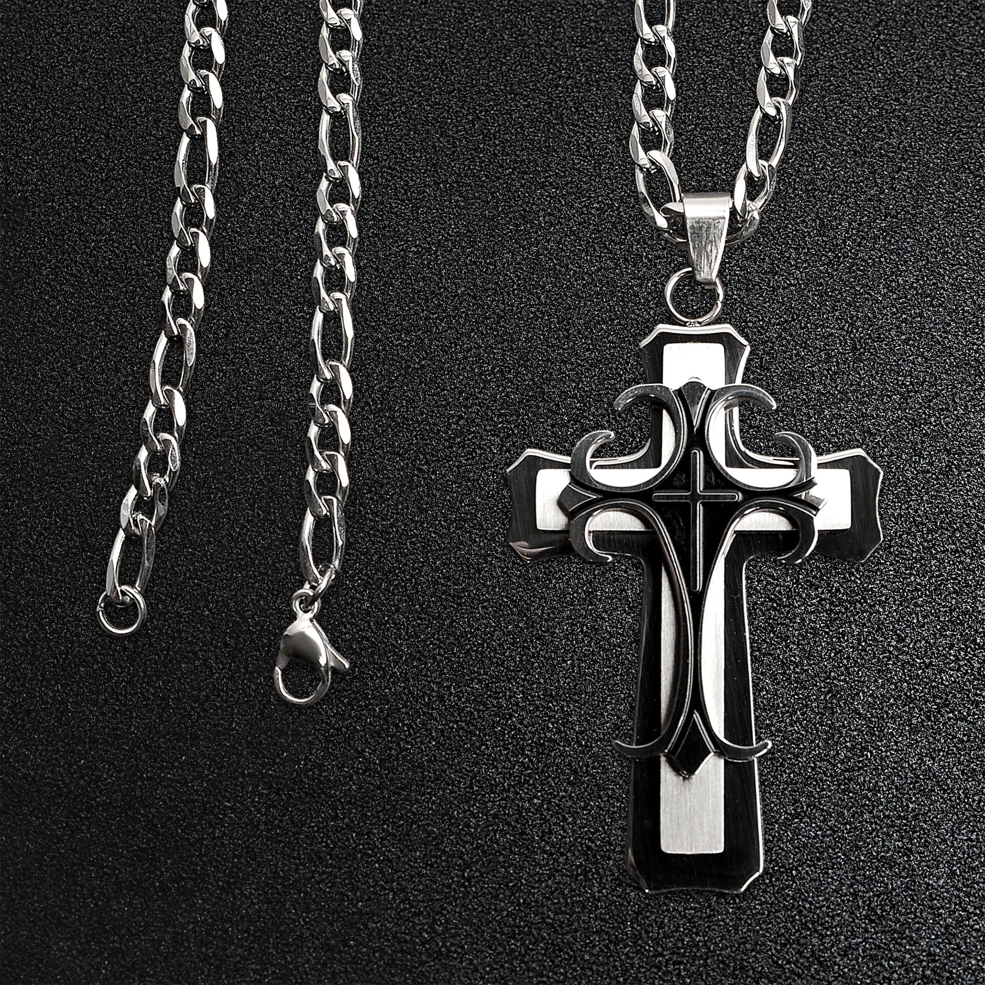 Stainless Steel And Black Layered Cross Figaro Chain Necklace