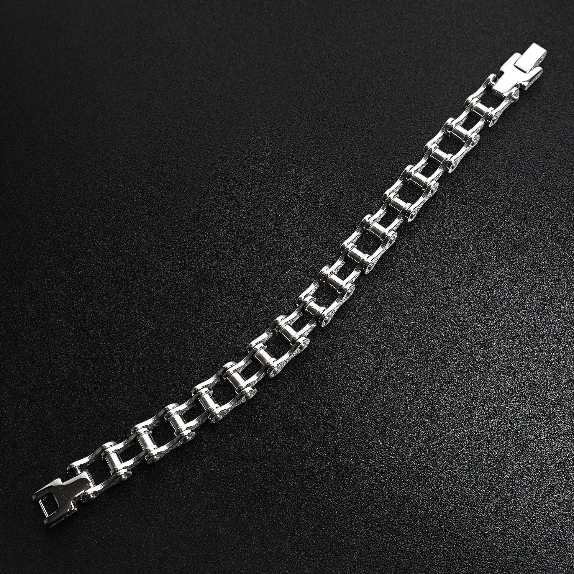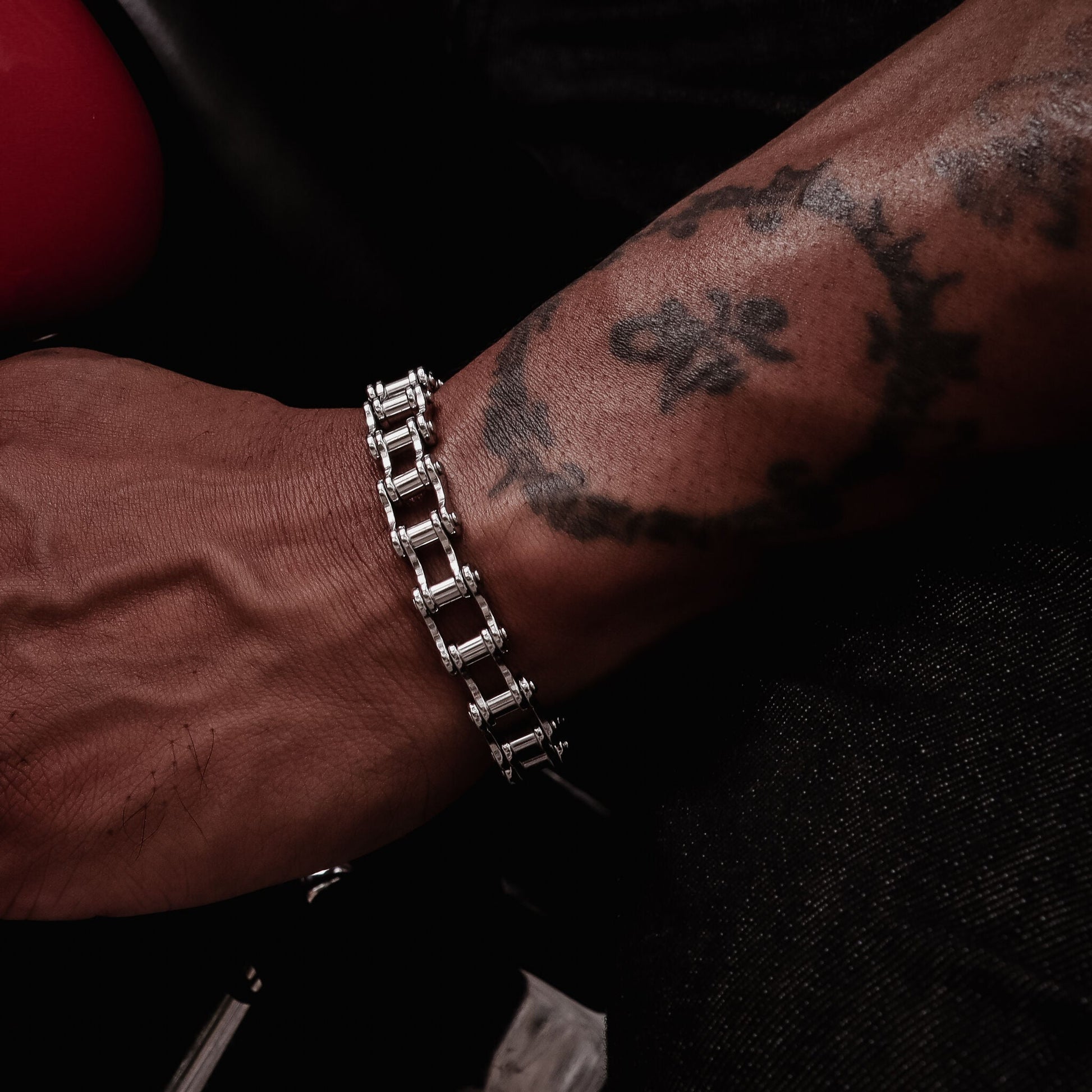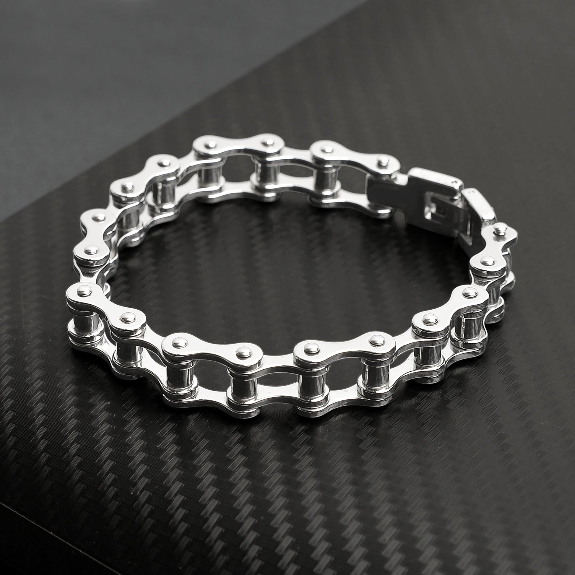 The Stainless Steel Bike Chain Bracelet from our Biker Collection is made of premium stainless steel that offers enhanced durability, even after exhaustive every day wear. The unique bike chain design combined with a polished finish makes the silver bike chain bracelet the perfect accent for every day outfits and more. Wear your new Stainless Steel Bike Chain Bracelet without worry in the water or while you sweat, all jewelry from Biker Jewelry Shop is made to last!