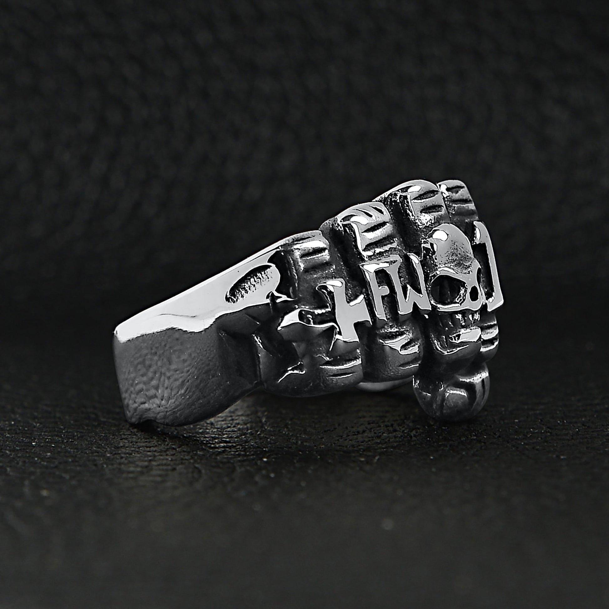 The Stainless Steel Biker Fist Ring from our Biker Ring Collection is custom molded and cast with a premium blend of surgical stainless steel that offers enhanced durability, even after exhaustive wear. The Biker Fist Ring features accents on the fist including a cross, "FW", skull, and a "1". Combined with a clean polished finish, the Stainless Steel Biker Fist Ring works great as a bold statement ring that can be worn in water or while you sweat without worry.