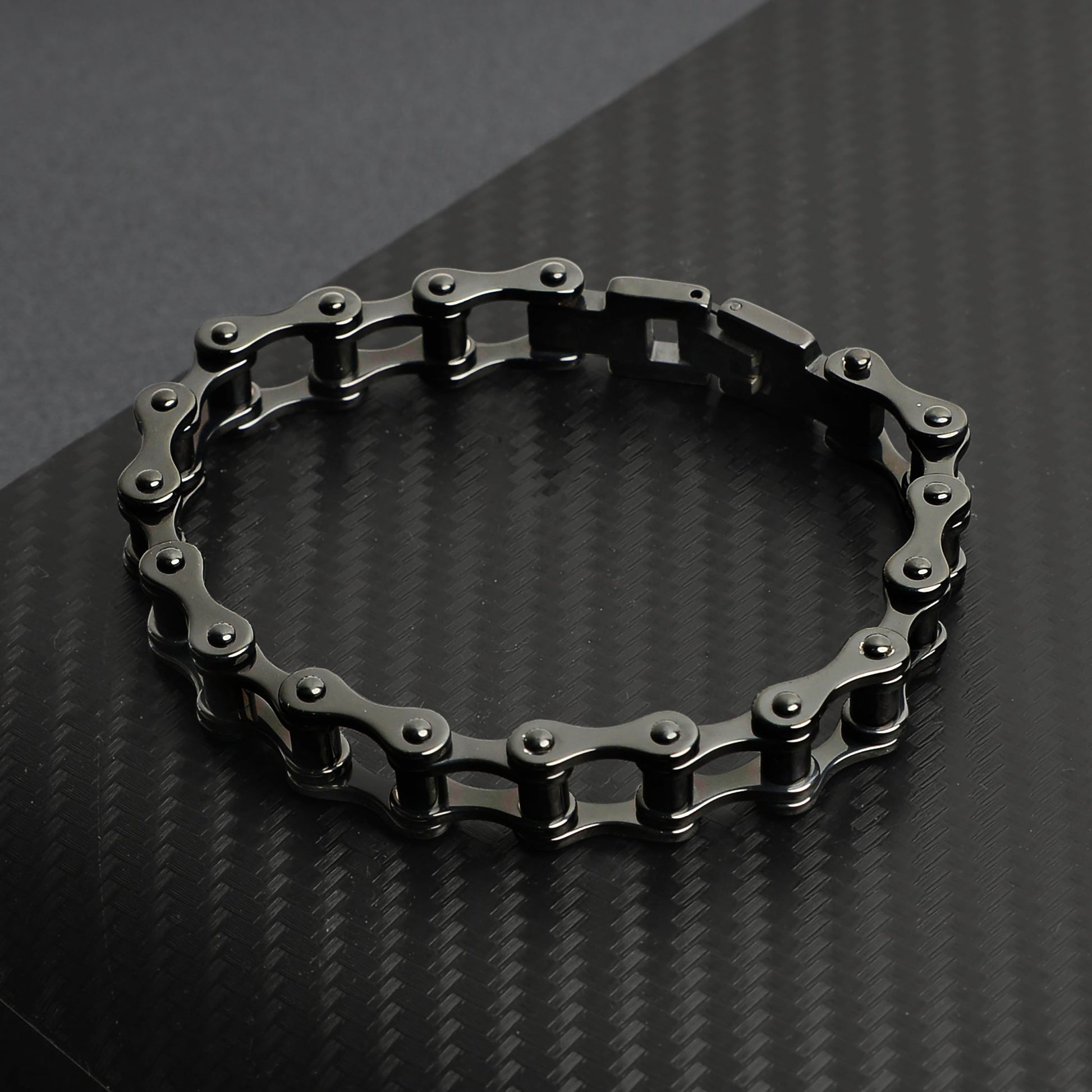 The Stainless Steel Black Bike Chain Bracelet from our Biker Collection is made of premium stainless steel that offers enhanced durability, even after exhaustive every day wear. The unique bike chain design combined with a polished black finish makes the bike chain bracelet the perfect accent for every day outfits and more. Wear your new stainless steel Black Bike Chain Bracelet without worry in the water or while you sweat, all jewelry from Biker Jewelry Shop is made to last!