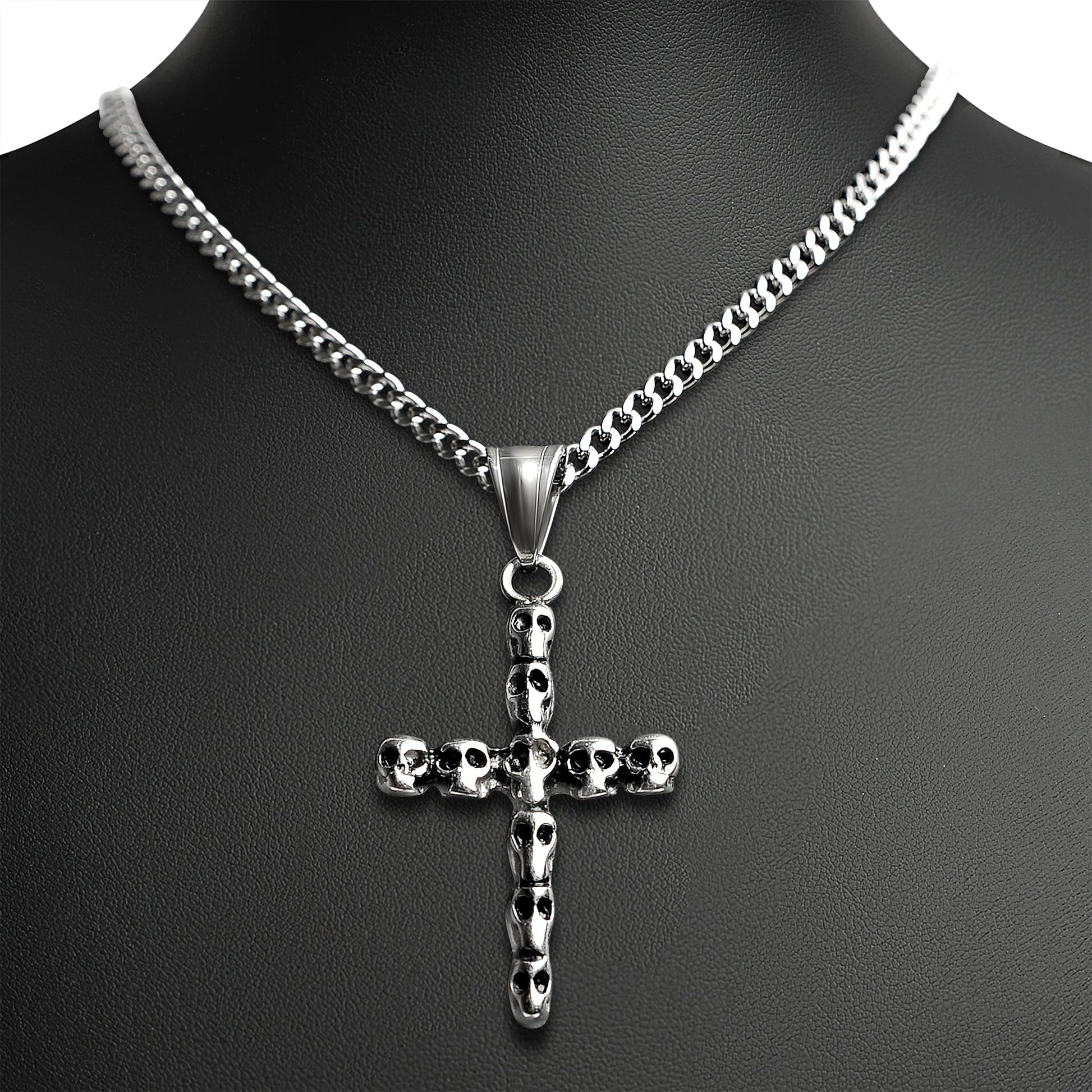 Stainless Steel Cross Of Skulls Curb Chain Necklace