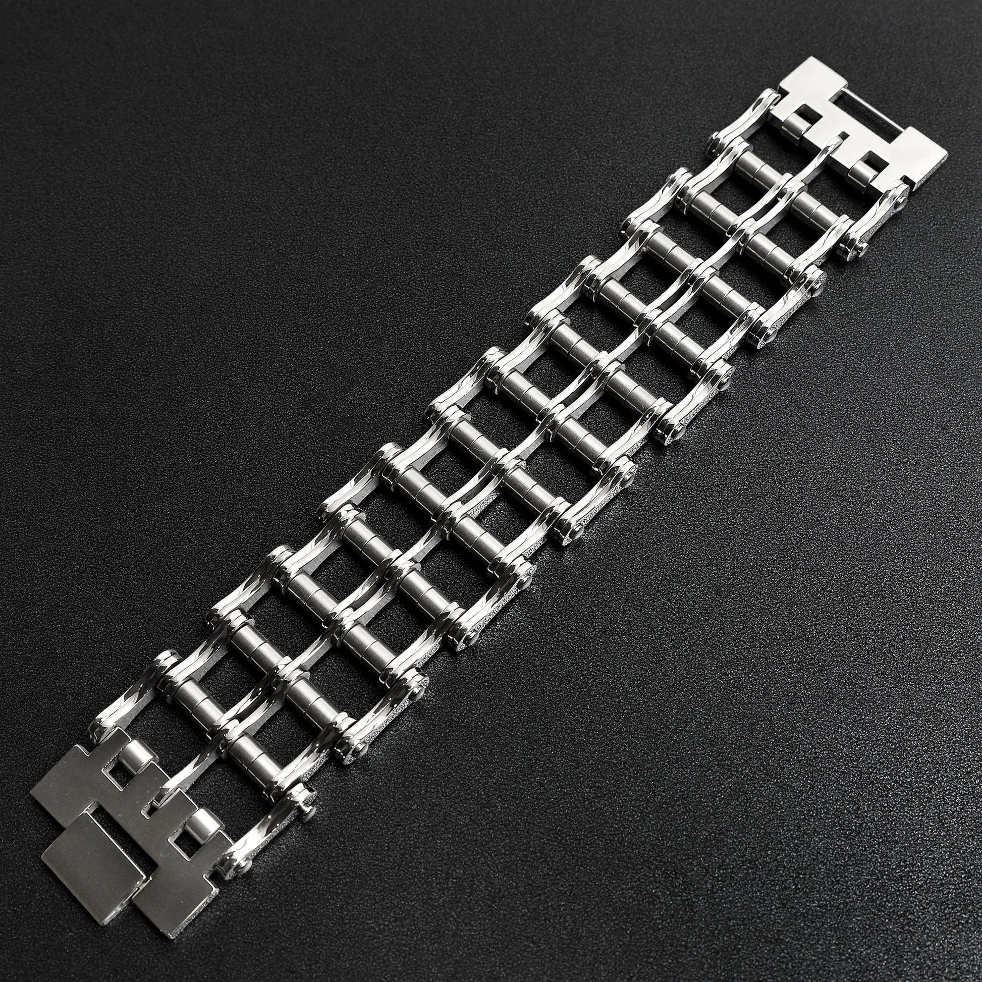 The Stainless Steel Heavy Double Bike Chain Bracelet from our Biker Collection is exactly as the name describes... heavy duty! This double bike chain bracelet is a bad boy and made of premium stainless steel that offers enhanced durability, even after exhaustive every day wear on the road. The unique double motorcycle bike chain bracelet design combined with a polished silver finish makes this the ultimate bracelet for Bikers. Wear your new Stainless Steel Heavy Double Bike Chain Bracelet without worry in the water or while you sweat, all jewelry from Biker Jewelry Shop is made to last!