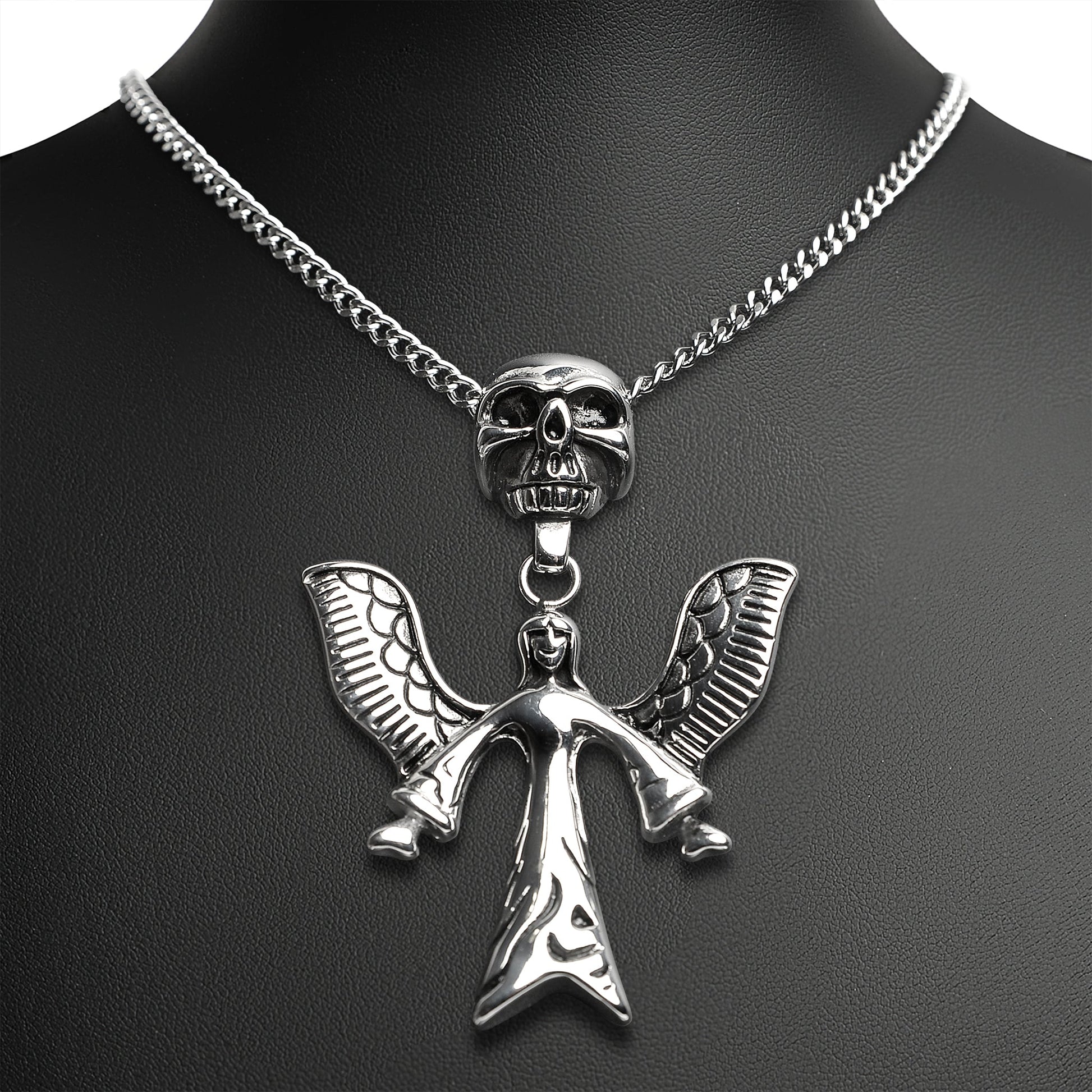 Description: Stainless Steel Large Angel Of Death And Skull Curb Chain Necklace