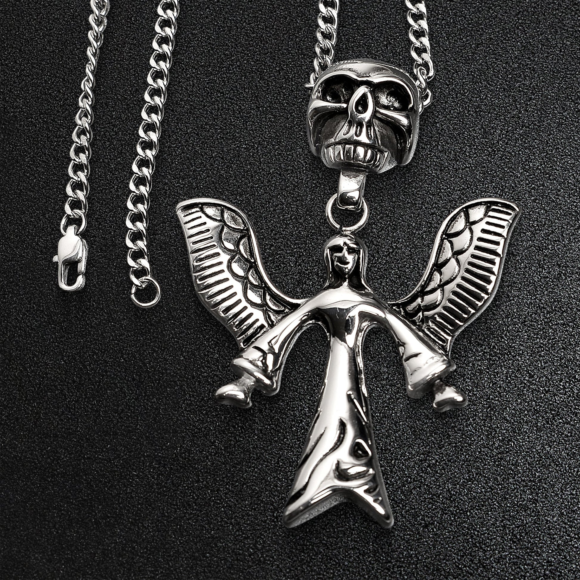 Stainless Steel Large Angel Of Death And Skull Curb Chain Necklace