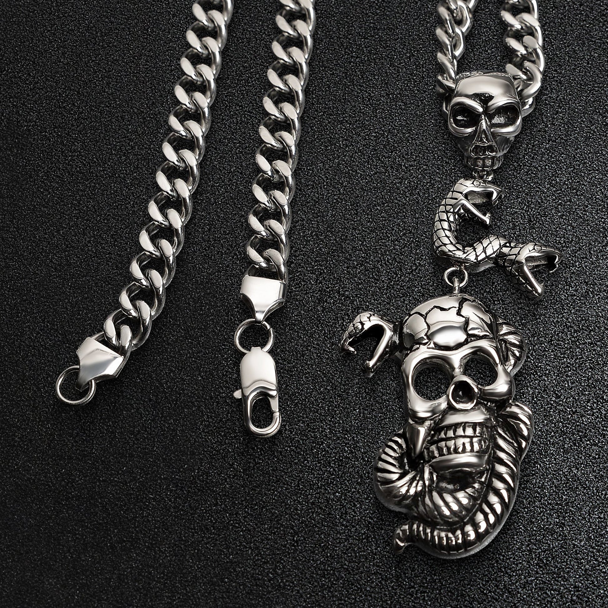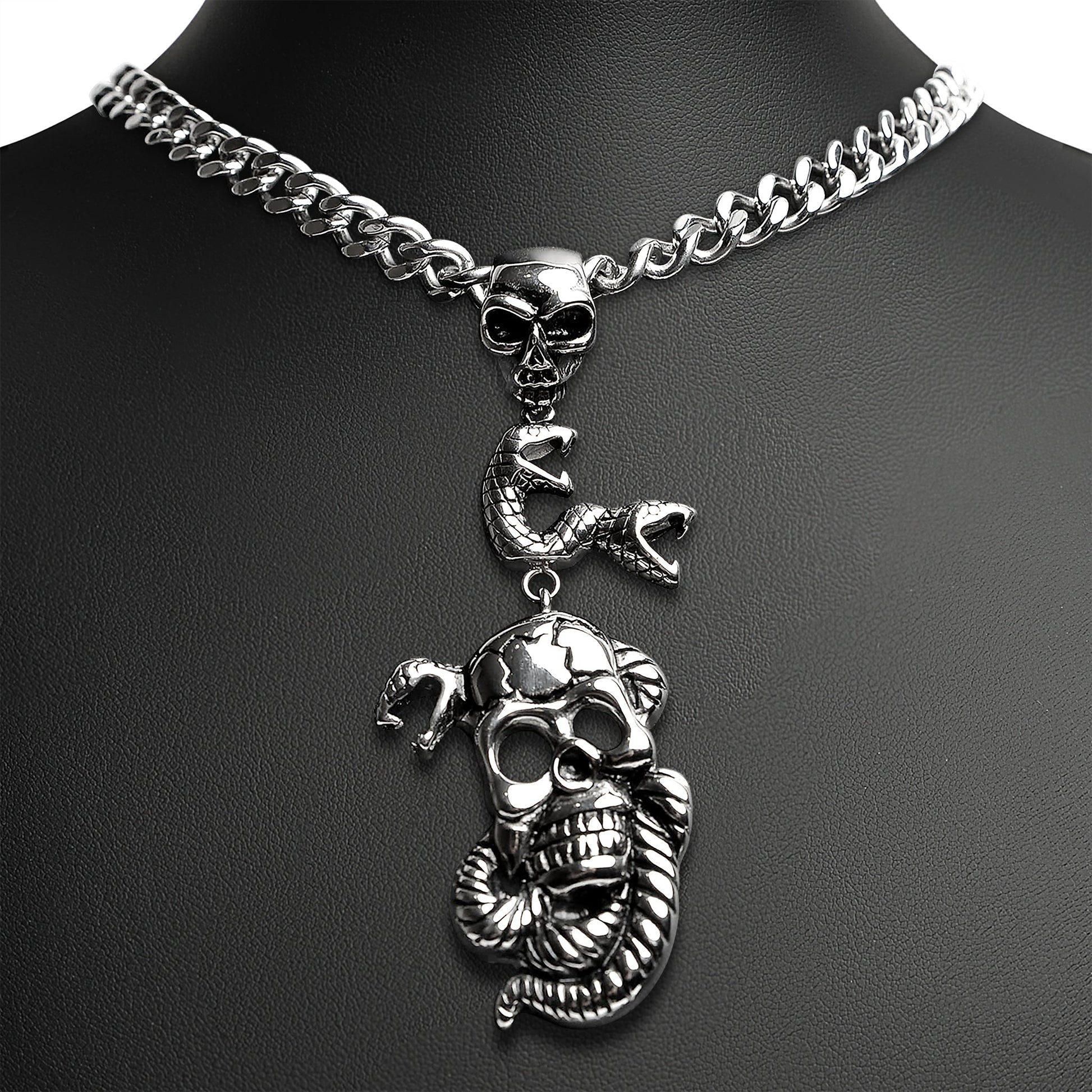 Description: Stainless Steel Large Skulls And Snakes Curb Chain Necklace