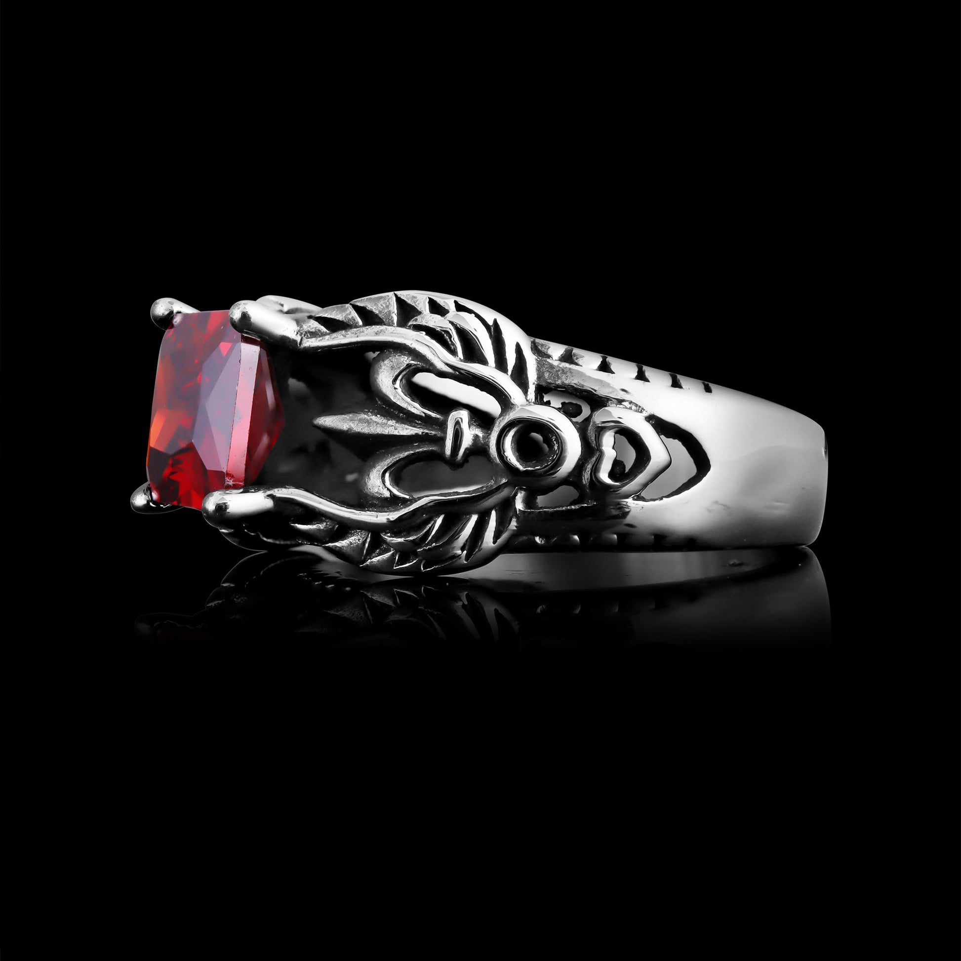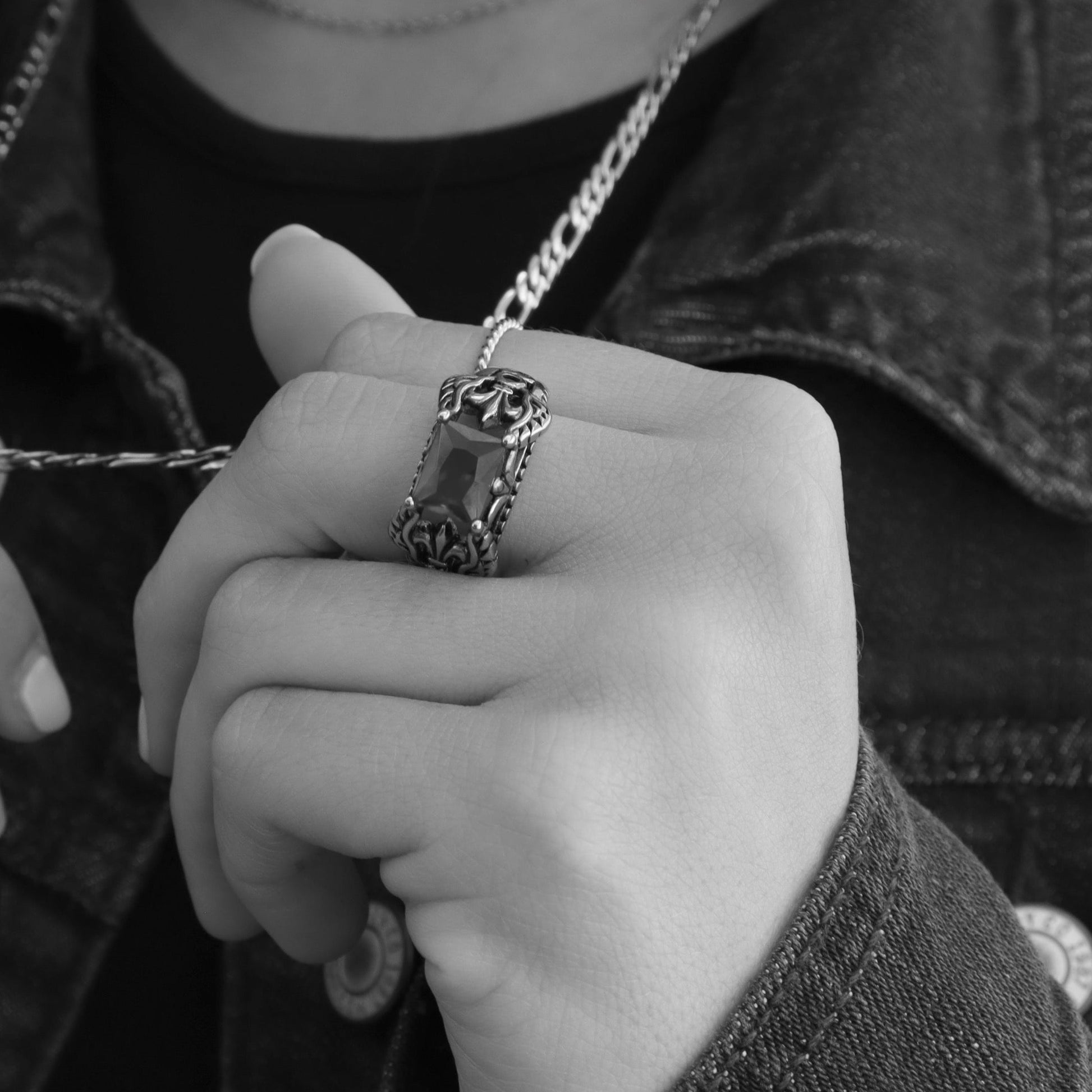 The Stainless Steel Red CZ Center Fleur De Lis Ring is custom molded and cast with a premium blend of surgical stainless steel that offers enhanced durability, even after exhaustive wear. Featuring a unique rectangular red cz stone with fleur de lis accents and a clean polished finish, the Stainless Steel Red CZ Center Fleur De Lis Ring looks great as an everyday statement ring that can be worn in water or while you sweat without worry.